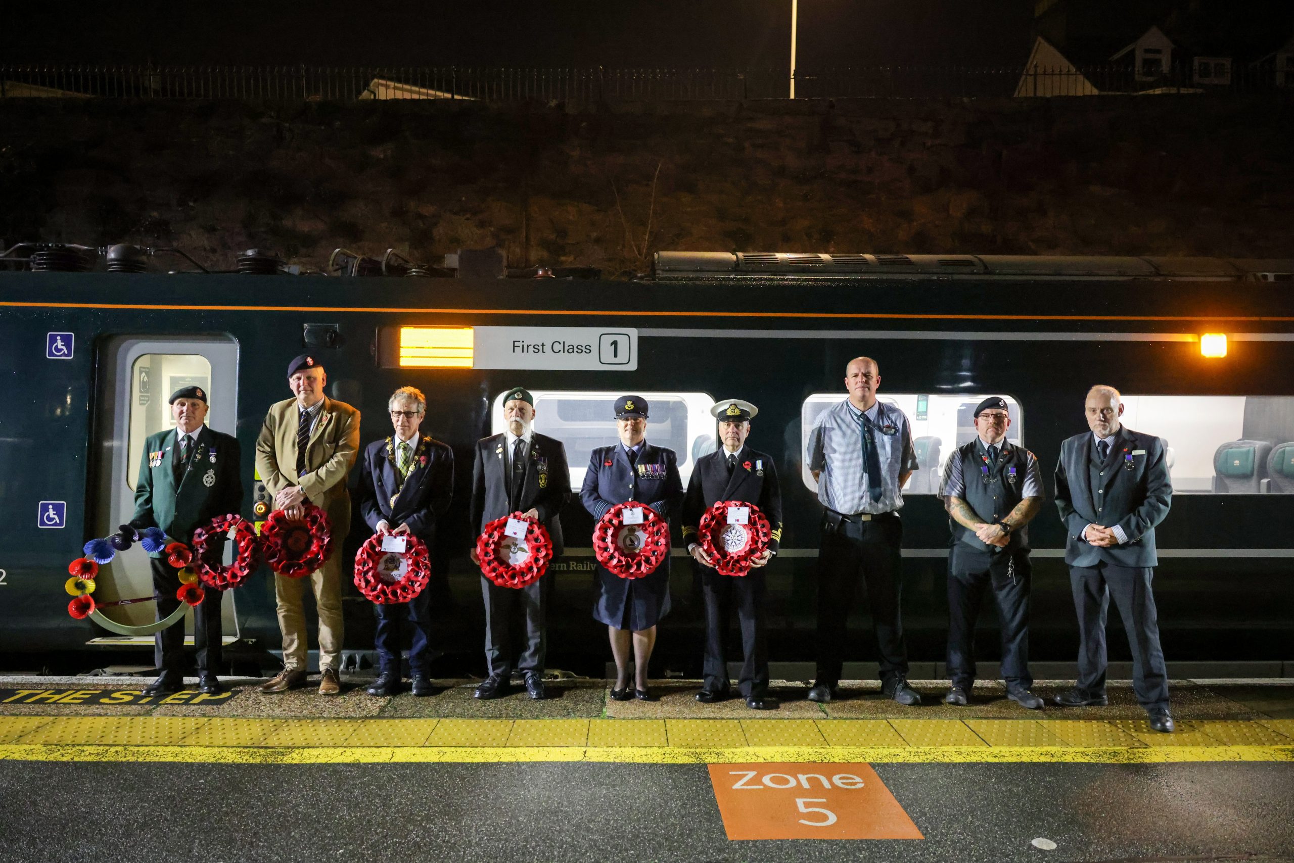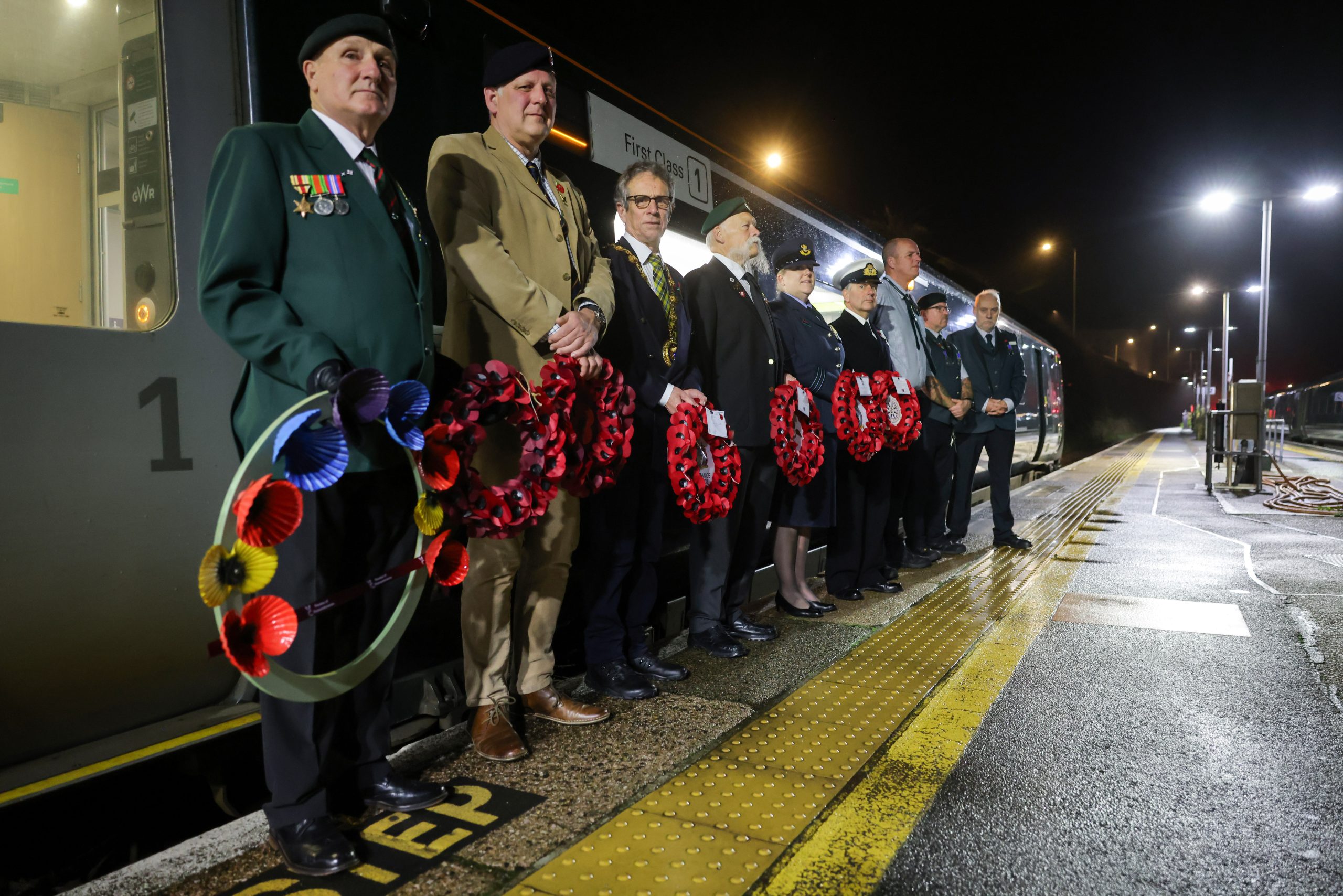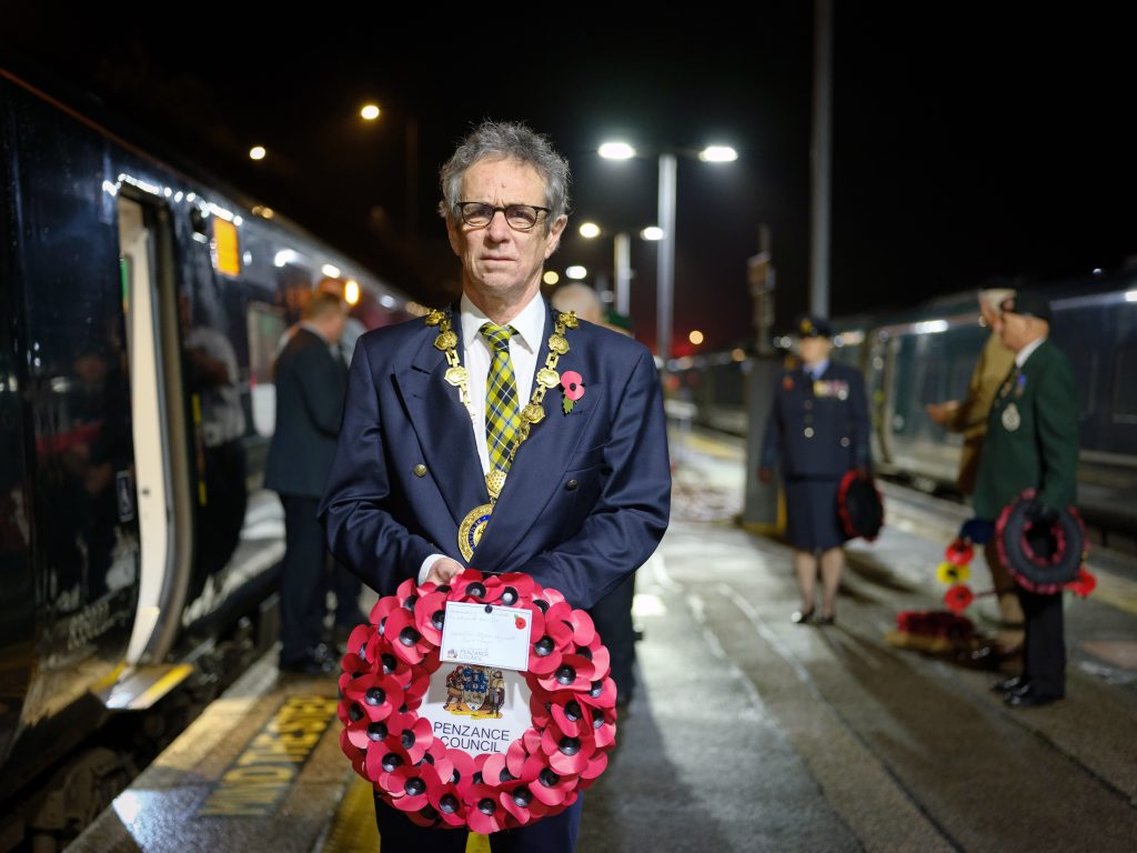 Acts of Remembrance began early in Penzance on Armistice Day, Tuesday 11 November, when the Mayor of Penzance joined representatives of Armed Forces charities to lay wreaths on the 5.03am GWR ‘Poppies to Paddington’ train as part of Routes of Remembrance 2025.