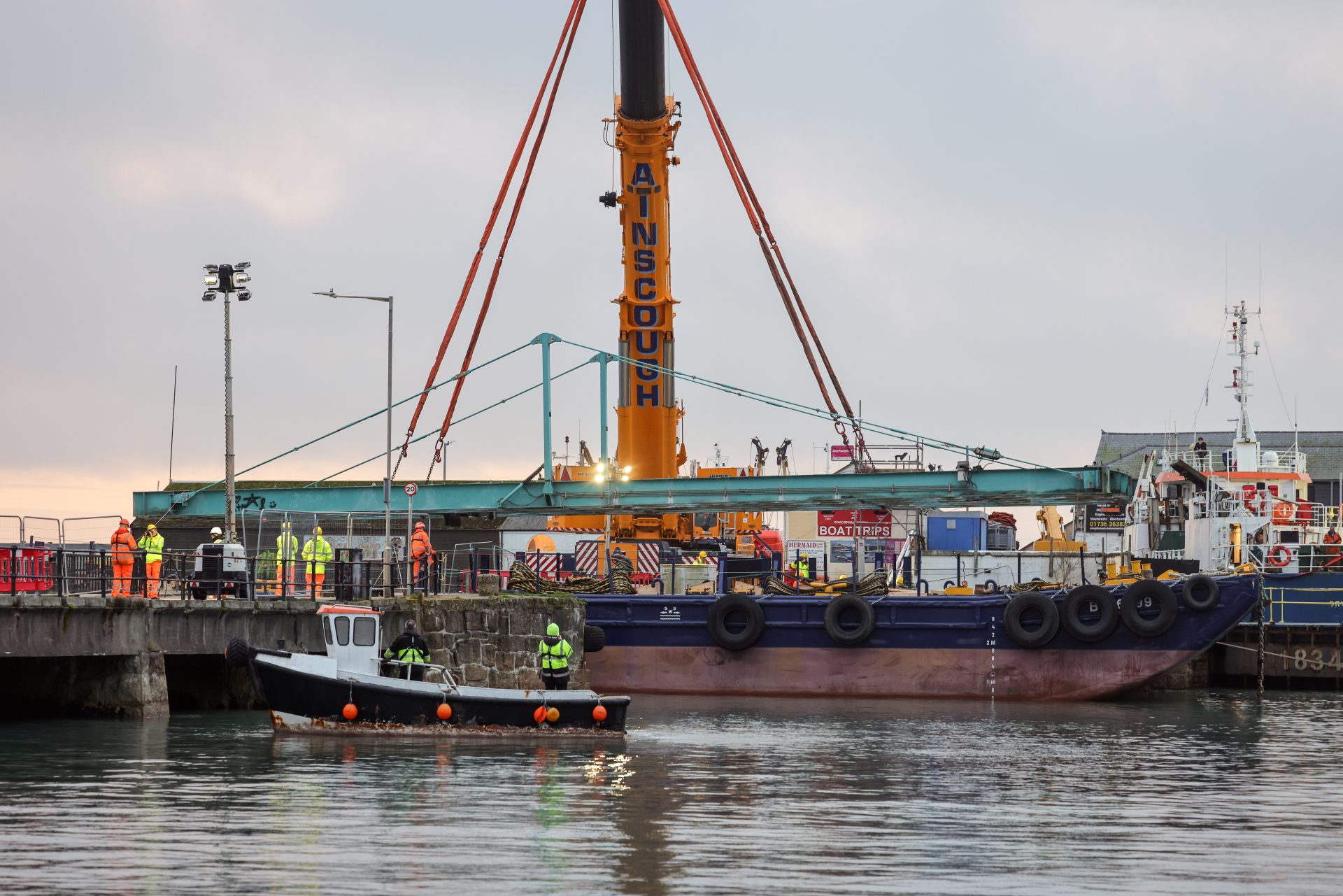 “At 6am this morning, the tug Vixen skilfully manoeuvred the 40‑metre barge into the channel between the dry dock and causeway, positioning it with precision. Already in place on the sea wall was the 650‑tonne crane — one of only four of its type in the country, ready to be attached to the 26‑tonne bridge. Using specialised lifting rigging, evenly distributed to balance the load, the bridge was connected using pre‑rigged lifting points and straps, and the crane then stabilised with a 90 tonne counterweight to balance it.