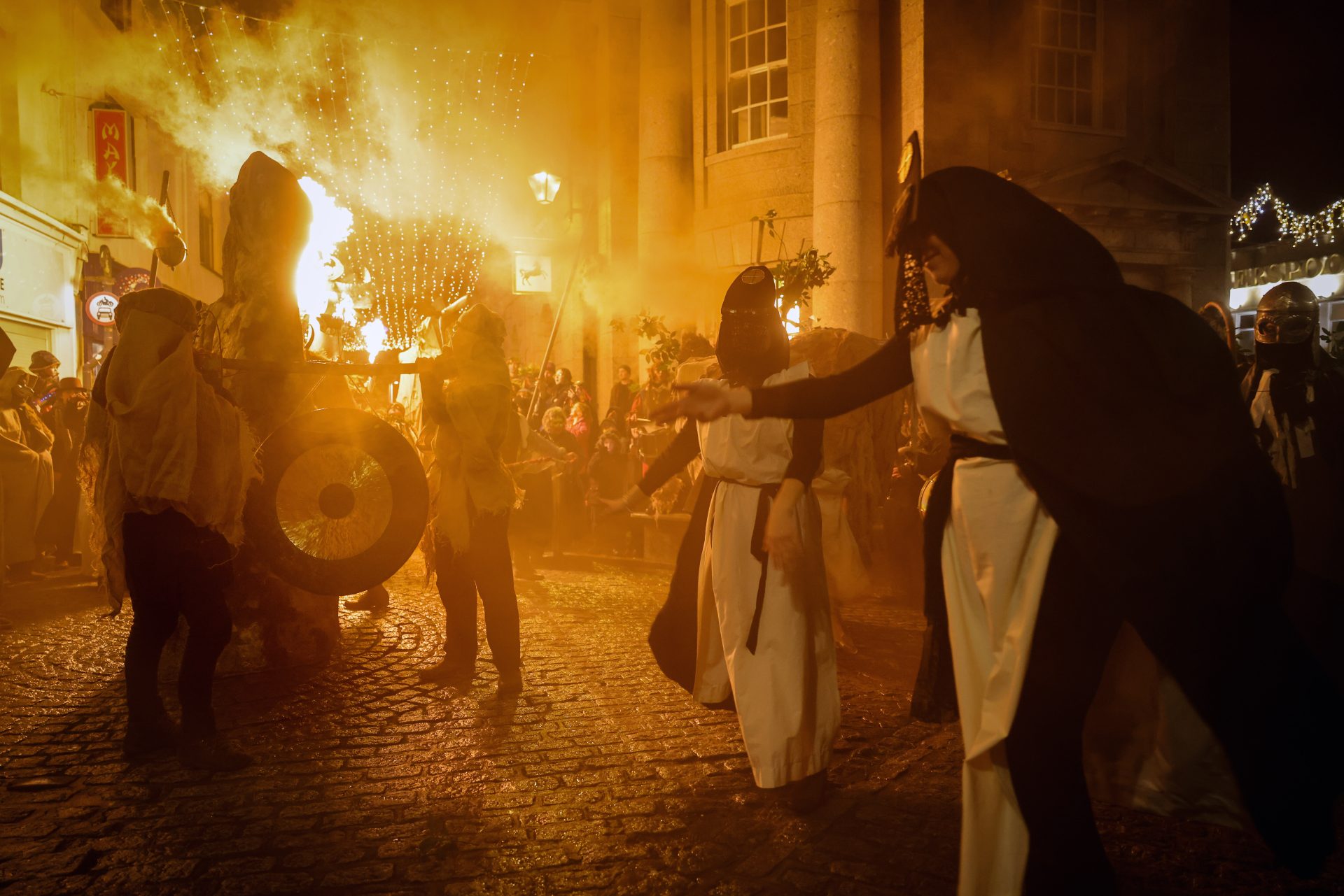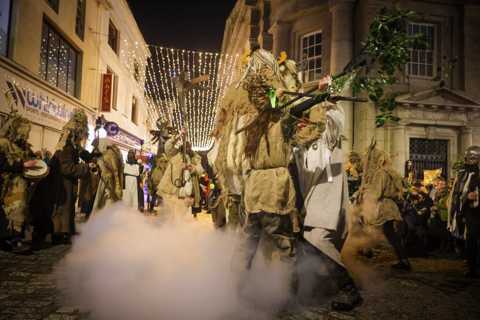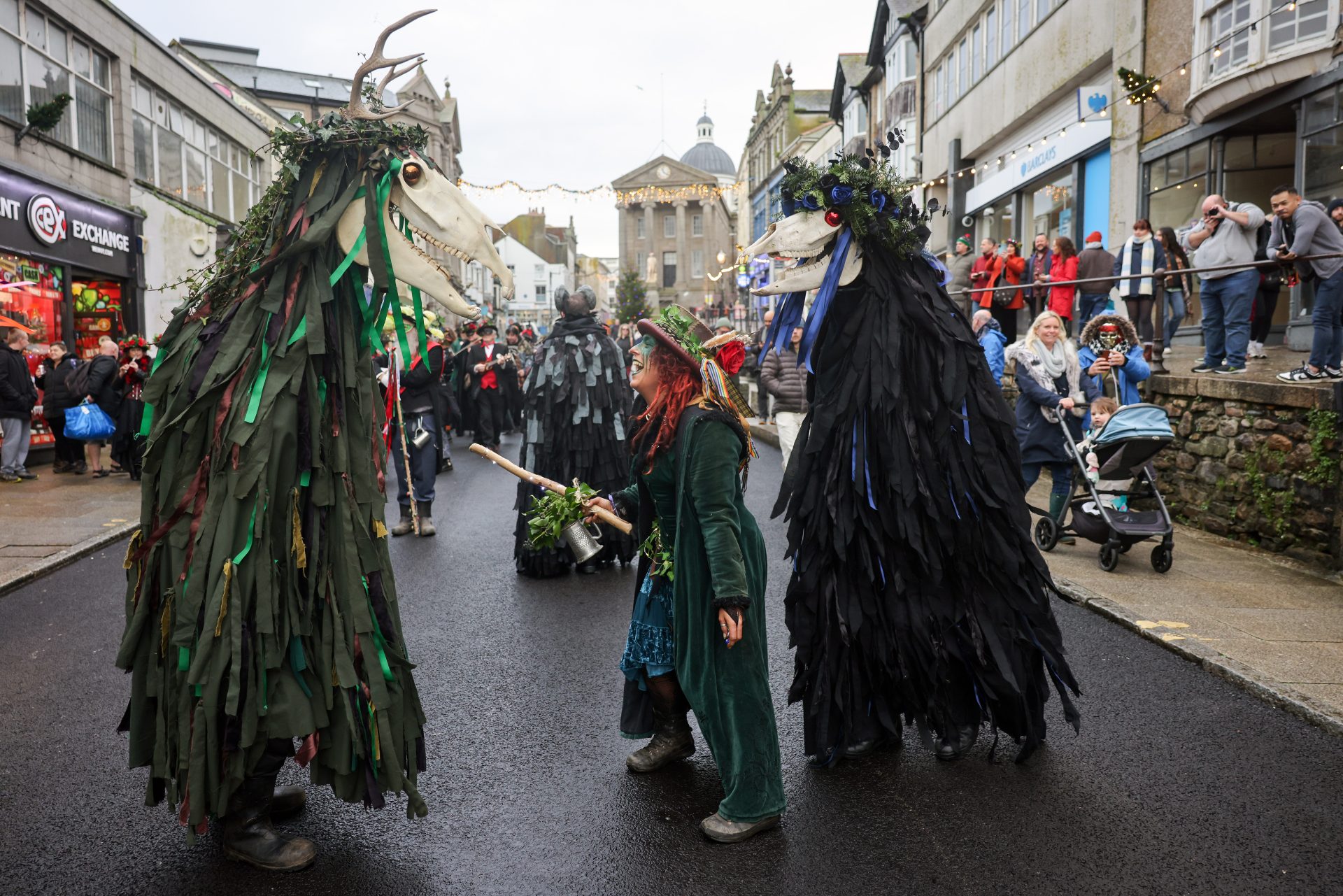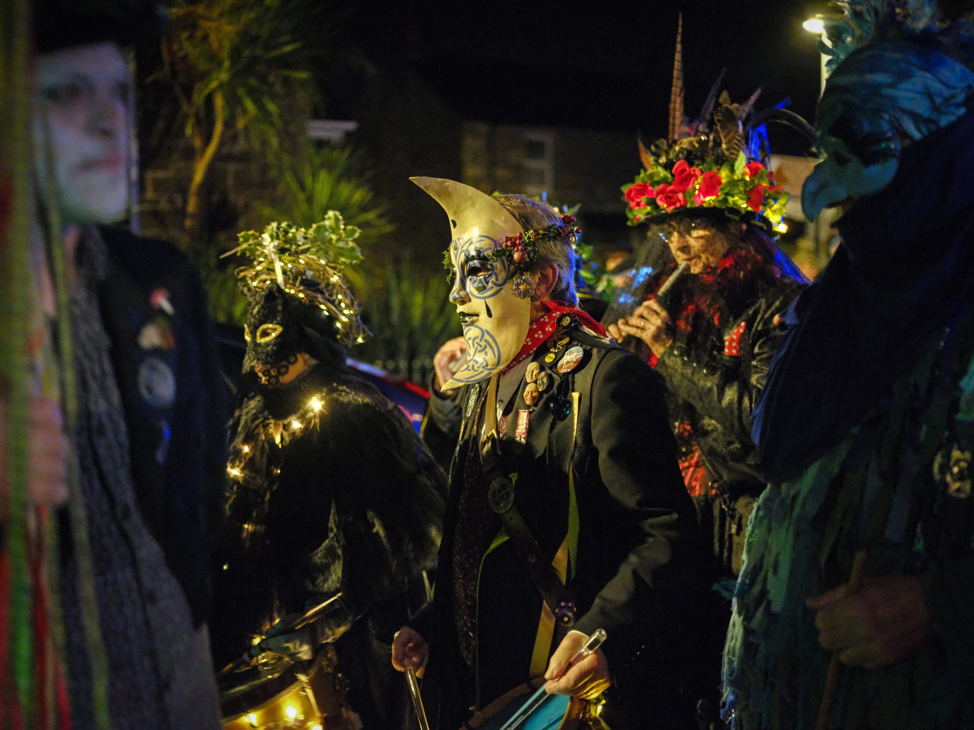 From early afternoon on Sunday, ‘Beasts’ and ‘Osses’ such as Pen Hood, Maw Bras and Alargh Du could be seen roaming the town, whilst Morris sides and carol singers gathered to perform. However, the real festivities began with the setting of the sun at 4.21pm, signalling the start of the Sundowner Parade.